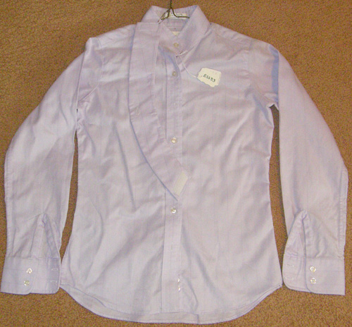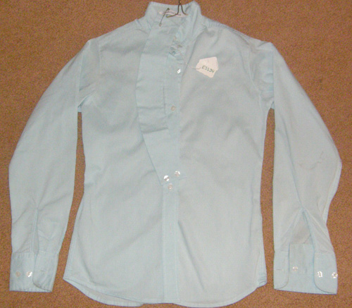 Long sleeve English show shirt with choker collar. 80% cotton/20% polyester, machine washable. Tagged size 38(Ladies), it flat measures 22 1/2" armpit to armpit across front, 25 1/2" mid shoulder to bottom hem, & has a 20" sleeve inseam. New but no tags, light stains on shoulder from being on hanger, may bleach out.