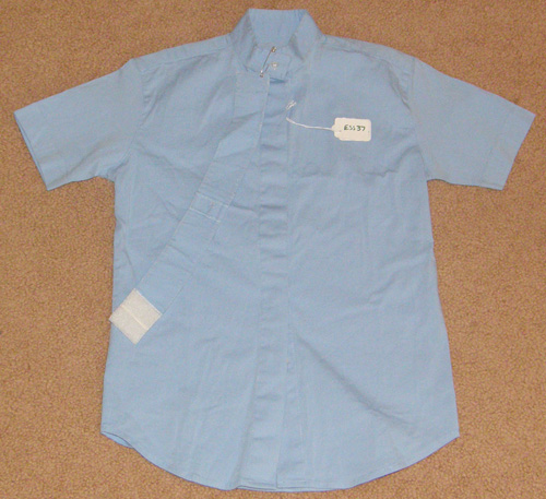 Sleeveless English show shirt with choker collar & front pocket. Machine washable 100% cotton permament press. Not tagged as to size, but it flat measures approx 14 1/2" armpit to armpit across front & 20" mid shoulder to bottom hem. Darted/fitted in front & back. Choker collar is a darker blue so may not be original to shirt, it has initials NJG embroidered on, & velcro is frayed.