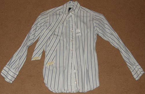 Short sleeved English show shirt with choker collar. 65% dacron/35% cotton. Not tagged as to size, but it flat measures approx 20 1/2" armpit to armpit across front & 26" mid shoulder to bottom hem. Sizing suggests a Ladies 16, but with very tapered sides, so is for the busty but slender shape. Vintage shirt with stitched in label with date of July '72. Choker collar has small snaps instead of velcro.
