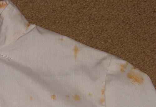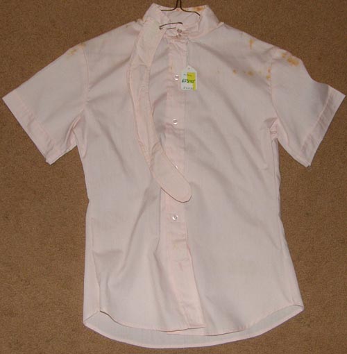Short sleeved English show shirt with choker collar. 65% poly/35% cotton, machine washable. Tagged size 10(Childs), it flat measures approx 16" armpit to armpit across front & 22" mid shoulder to bottom hem. Lots of rust stains/marks on shoulders & top half from being & contact with metal hanger. Marks are not visible when wearing a jacket.