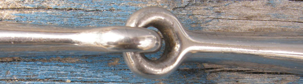 Slow twist jointed snaffle mouthpiece with 6 3/8” cheeks. Mouthpiece measures 5" inside bulbs or a tight 5 1/4" inside cheeks. A fairly heavy bit, great for added control while encouraging the horse to lower its head. Use with bit loops for added leverage, see BLP1. Brand unknown. A few chew marks on mouthpiece but nothing rough.
