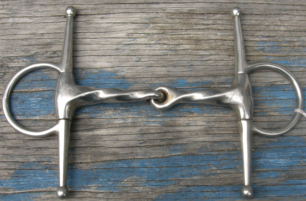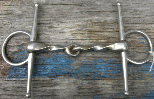 5” slow twist jointed snaffle mouthpiece with 6 1/2” cheeks. A fairly heavy bit, great for added control while encouraging the horse to lower its head. Use with bit loops for added leverage, see BLP1. Brand unknown.