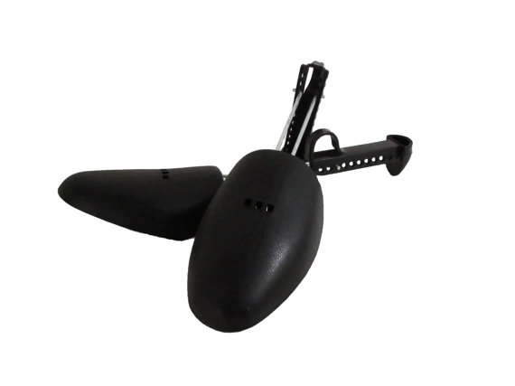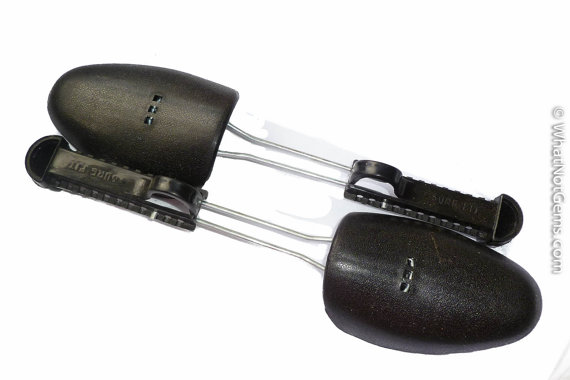 Keep your shoes or boots in good shape with this lightweight design attractive pair of adjustable Sure Fit shoe trees. Size is easily adjustable to cover multiple sizes. Marked Sure Fit on handle but age unknown. Made of black plastic & metal rods that squeeze together to move up or down the handle to adjust size.