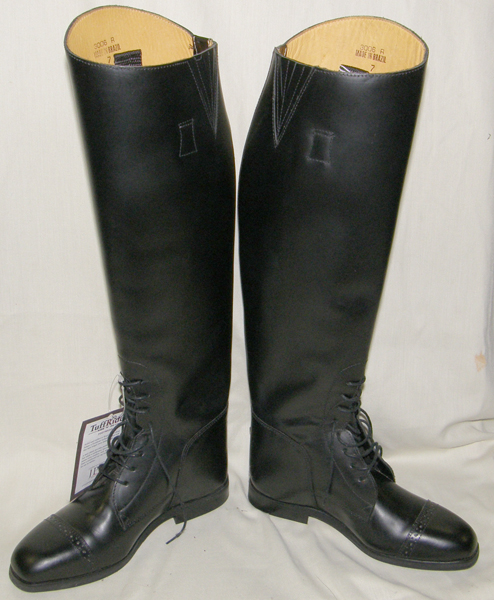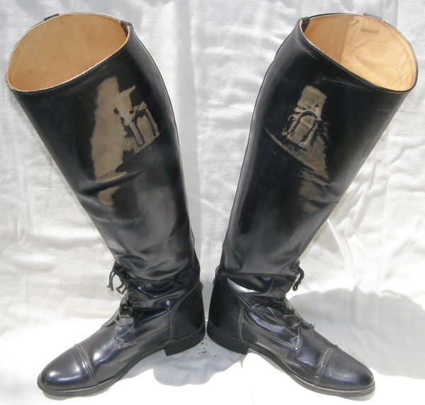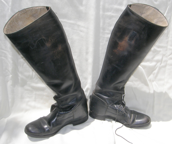 Tall English leather dress boots, numbers inside boots 6 1/2B 710U7 1393, all leather uppers, sewn in boot loops, & lightly textured sole. Measures 18" from ground to back of boot at lowest spot, 12 1/2" calf, 10" foot measured toe to heel on sole & 3 1/4" at widest point of sole. Nice dress boots in good used condition but do have some scuffs on inside of boots from contact with leathers/saddle & scuffs on toes with soles showing some wear.