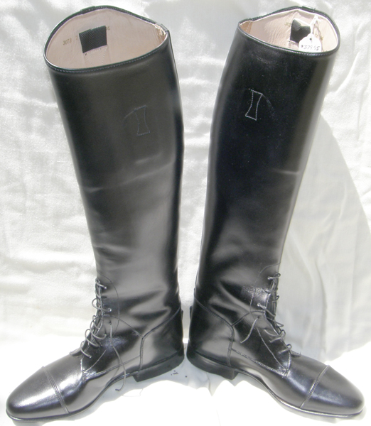 Leather tall English field boots with full length zip in back. Features Spanish tops, fully lined in leather, elastic insert that runs length of zipper to allow for better fit, pretied/fixed laces, & elastic strap with snap at top to keep zipper closed. Tagged size 39(european sizing) which converts to US size 8 1/2 & measures 18 1/2" from ground to back of boot at lowest spot, 14" calf not including any stretch from elastic insert, 10 1/2" foot measured toe to heel on sole & 3 3/4" at widest point of sole. Numbers inside boots are 39(size) R 09 400 36 & has a Z on outsize of each heel. Excellent used condition & zippers work easily.
