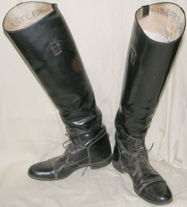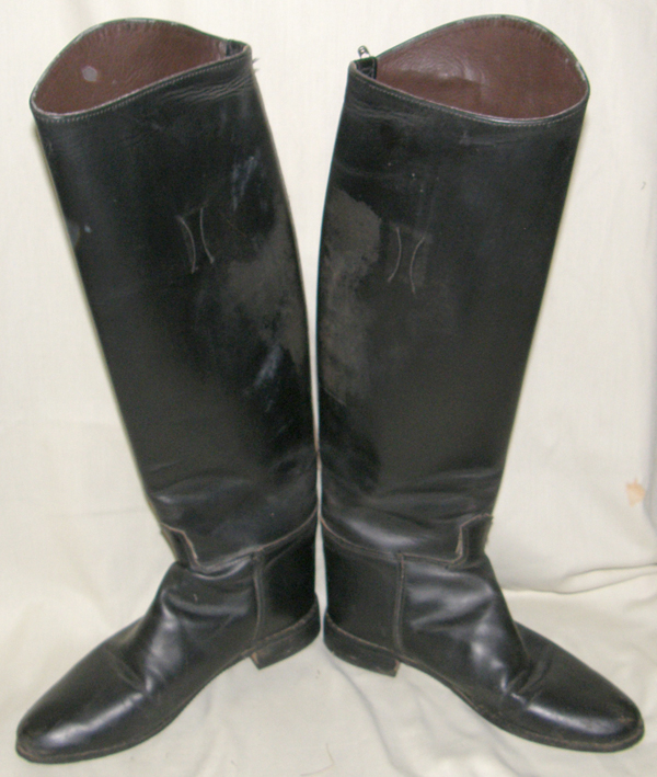 Tall English leather dress boots, numbers inside boots 8 1/2R 610 43 49 97, all leather uppers, sewn in boot pulls, spur rest on back of heel, ridged soles. Measures 19" from ground to back of boot at lowest spot, 13 1/4" calf, 10 7/8" foot measured toe to heel on sole & 3 1/2" at widest point of sole. Good used condition with some scuffs on inside from contact with leathers/saddle, some rippling of leather on top of left toe(may be flaw in leather hide, not damage), inside boot tops/liners are flaking & minor stress at flex points.