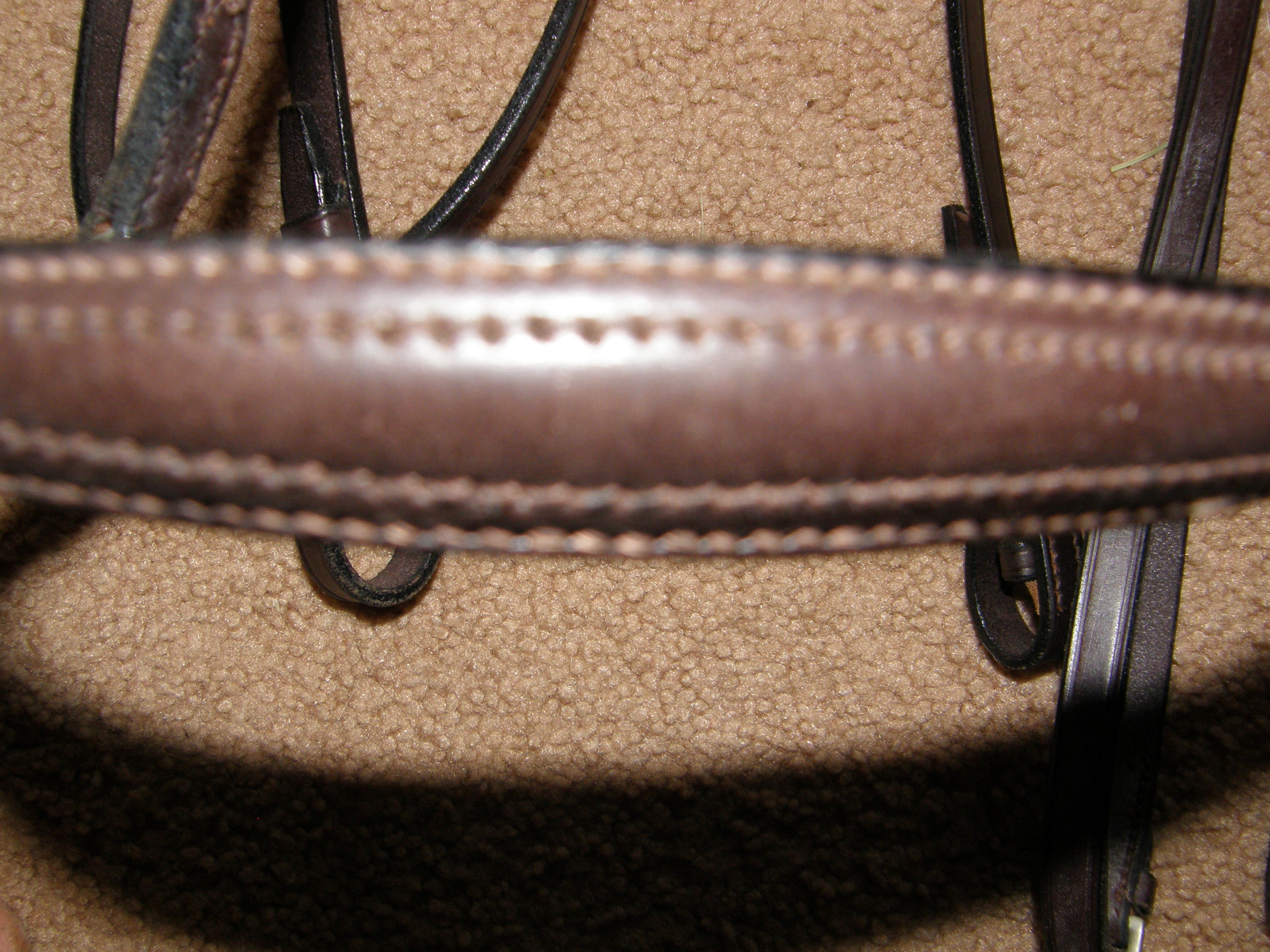 This snaffle bridle is 1/2” wide flat leather with scored & darkened edges, fancy stitching on round raised noseband & browband, hook stud ends,15" browband & 10” cheeks. Measures approx 33" at smallest & 41" at largest adjustment, & noseband measures 22" at smallest & 26" at largest adjustment. Comes with 5/8” laced reins that are approx 52” long. Stamped C for Cob on caveson but measurements should fit a horse as well. Brand unknown, probably imported, leather is supple but a bit stiff to adjust. Has a few cricket chews to surface of leather, mainly on inside of bridle but a few on outside too(see bottom photo).