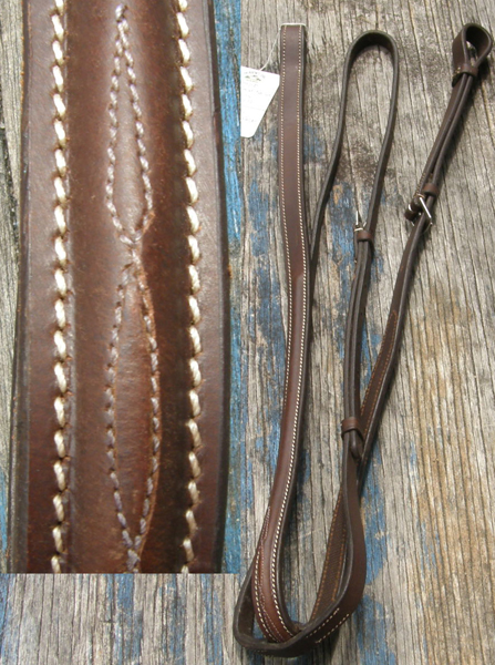 3/4" wide leather with rounded raised & fancy stitches center, loop that attaches to caveson under chin, loop to attach to girth, & has 1/2" flat neck strap. Stamped P for Pony, it measures 41 1/2" as adjusted now on 3rd shortest hole out of 8 factory punched holes. Not stamped so brand unknown, but good quality leather with rubbed & darkened edges & white contrast stitching.