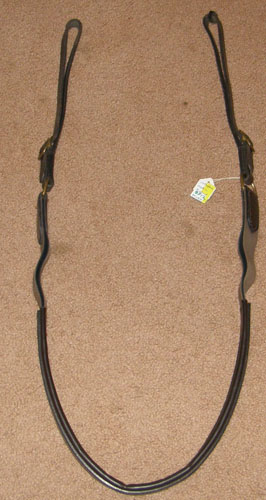 Flat leather running martingale with scored edges, 1/2” matching flat leather neck strap & stainless steel rings. Measures 47” as adjusted now in 3rd hole out of 12 holes. Stamped Collegiate. Leather is supple & clean, only has some rust on tongue of buckle on strap back to girth.