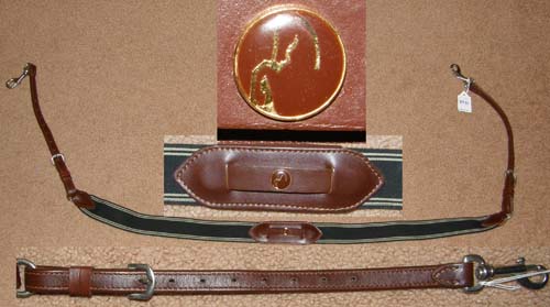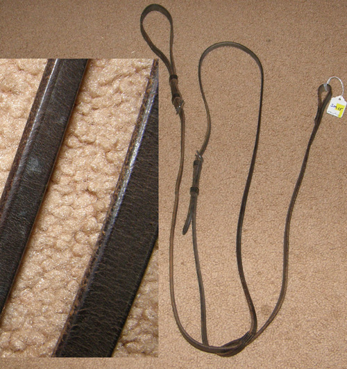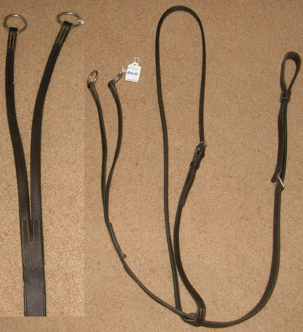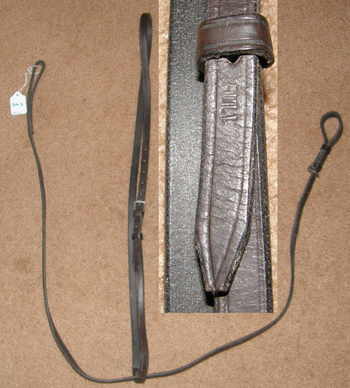 5/8” quality flat leather. Loop attaches to English caveson under chin; Loop to attach to girth; has neck strap. Not stamped as to maker.