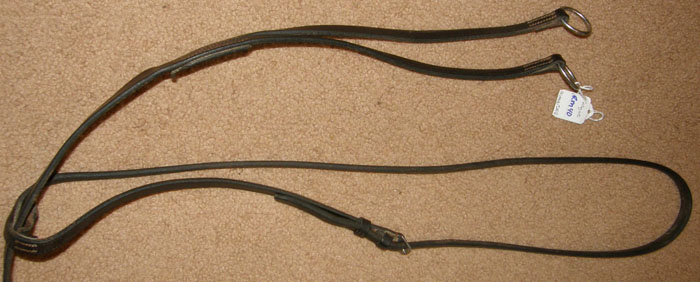 5/8” quality leather. Loop attaches to English caveson under chin, loop to attach to girth, has 3/8” flat neck strap. Stamped Made in England. Measures 47” as adjusted now with room to make longer or shorter.