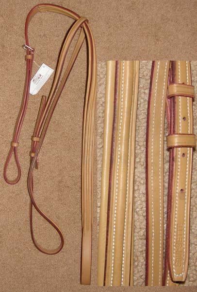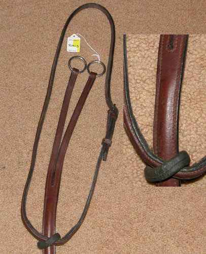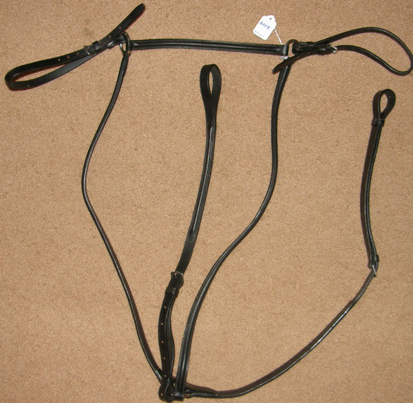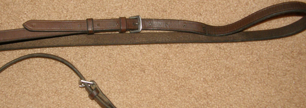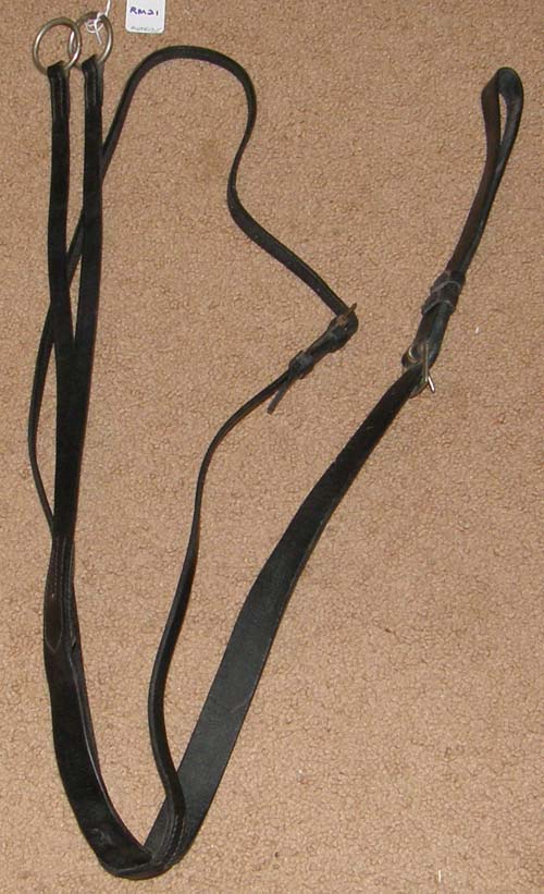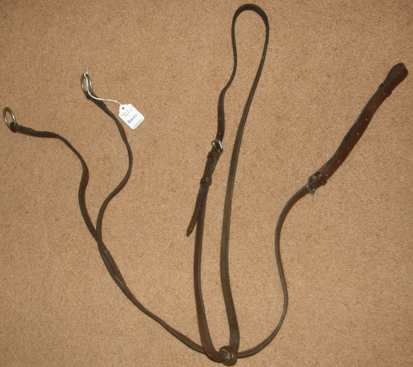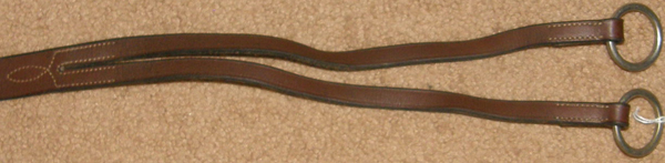 1” flat leather running martingale with darkened edges, 1/2” flat leather neck strap. Measures 53” as adjusted now in 3rd hole out of 7 holes.