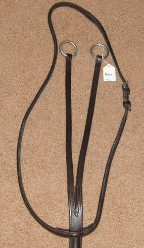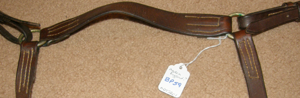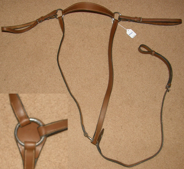 Breastplates help to keep the saddle in place. It attaches to the front D's on the saddle and between the horse's forelegs to the girth. Ideal for hunting, eventing, jumping or in a hilly country. Round raised 3/4” wide leather strap back to girth & 5/8" wide chest pieces with rubbed & darkened edges & either stainless or nickel rings as they do not react to magnet. Comes with buckle in standing martingale attachment. Side/chest pieces measure 23 1/2" not including rings or tugs. Narrow design for showing. Brand unknown, only stamped Cob although this measures out to be more like horse.