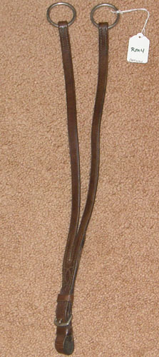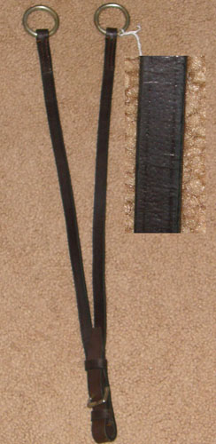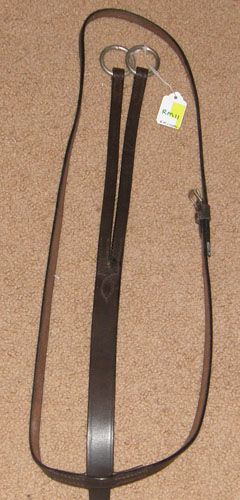 1” flat leather running martingale with darkened edges, narrows to 3/4“, 1/2” flat leather neck strap. Measures 47” as adjusted now in middle hole out of 7 holes.
