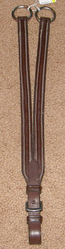 Running Martingale Attachment in rounded raised leather with white contrasting stitching, buckles into any breast plate with a center ring. Almost 15” long, 5/8” wide leather, single buckle end, 1 1/4“ diameter rings.