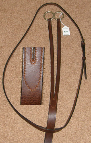 11/16” rounded raised leather running martingale with darkened edges, 5/16” neck strap, both have raised center. Decorative loop stitching at V in leather. Measures 44” as adjusted now in 4th hole out of 7 holes.