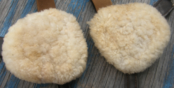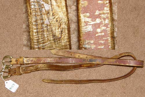 3/4” leather replacement tugs or straps for Western breast collars. Approx 24” long at shortest adjustment with 5 factory punched holes. Straps are of nice flexible leather, but looks like someone painted them for an antique type finish. You would need to scrape or use paint remover to remover outer layer as they look awful, but feel nice underneath. Brass buckles. Sold as a pair.