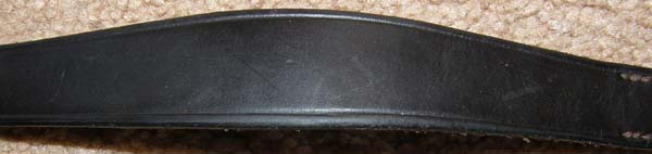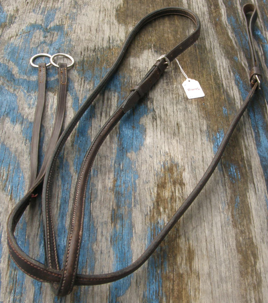 3/4” rounded raised leather running martingale with darkened edges & round raised 5/8” neck strap. Measures approx 45” as adjusted now in smallest/shortest hole out of 5 holes. Brand unknown. Excellent hardly used condition except surface cracking near last few holes on neck strap. Will never interfere with use unless you need to use the largest adjustment on neck strap. Nice quality, supple leather with brown stitching.