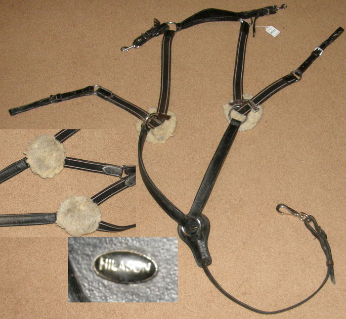 Flat 1/2" wide leather breastplate with loop to attach to girth, shaped flat leather over withers, 2 straps attach to saddle rings with added trigger/scissor snaps, a ring at the center to attach draw reins and other training devices, & it is adjustable on both sides of neck. Believe this was a larger size cut down to fit a Pony/Cob as side straps have added holes punched, & tug straps are cut down with snaps added for ease in putting on/off. Side pieces measure 16 1/2" as adjusted now not including rings or tugs. Some surface cracking when tightly bent, mainly on strap back to girth, & some wear around a few of the holes. Brand unknown.