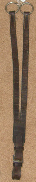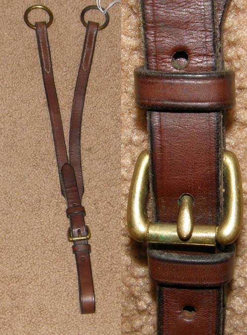 Running Martingale Attachment in flat leather, buckles into any breast plate with a center ring. Approx 18” long on middle hole with 3 factory punched holes, 5/8” wide leather with darkened & scored edges, single brass roller buckle end & brass rings. Leather is soft & lovely. Stamped C on back for Cob.
