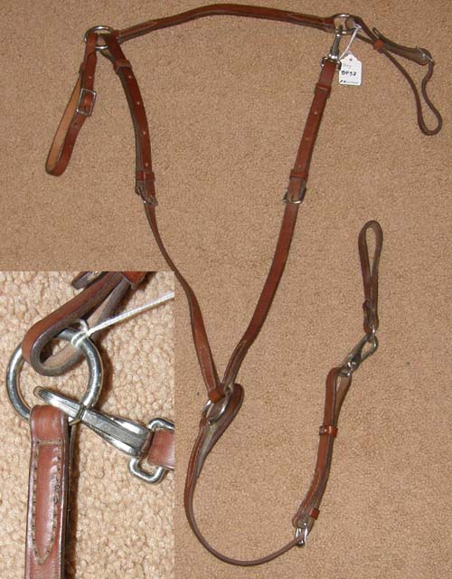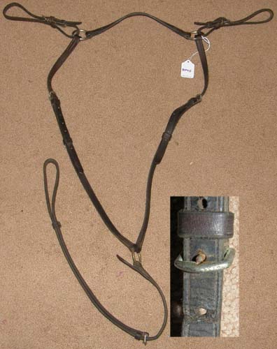 Flat 1/2" wide leather breastplate with loop to attach to girth, 3/4" wide flat leather over withers, 2 straps or tugs attach to saddle rings, a ring at the center with pinch guard to attach martingale attachments, draw reins and other training devices, & it is adjustable on both sides of neck. Easy to add snaps to tug straps for ease in putting on/off. Side pieces measure 21" as adjusted now not including rings or tugs with 7 more holes on each side to make larger & 2 to make smaller. Some wear around a few of the holes & buckle tongues are rusty but all buckles work. Brand unknown, but leather is quality.