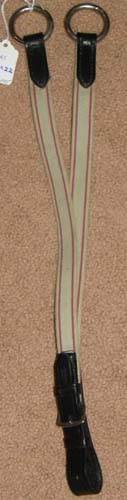 Running martingale attachment with elastic inserts in flat leather with scored & darkened edges, buckles into any breast plate with a center ring. Approx 18” long, 3/4” wide leather with elastic inserts. Elastic allows give to the horse that doesn't like a lot of restraints to it's face, & softens the feel between bit, reins & hands with minor downward pressure. Looks never, never used with only minor dirt on elastic, but that may have been from storage.
