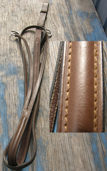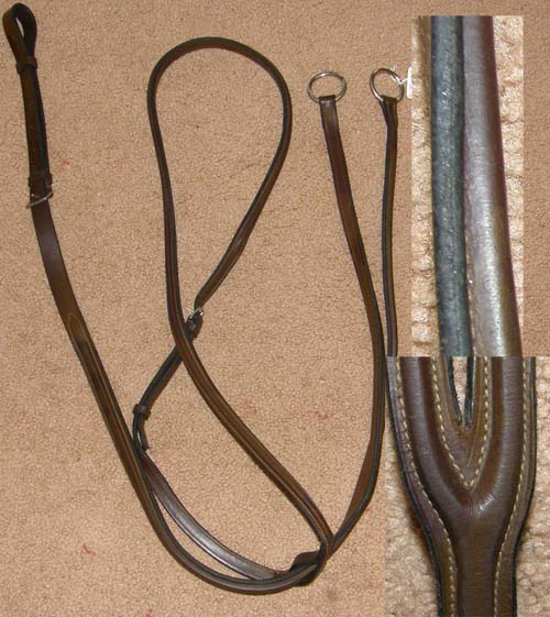 3/4” square raised leather running martingale with darkened edges, 9/16” neck strap, both martingale, neck strap & split straps of martingale all have square raised center. Measures approx 50” as adjusted now in 1st hole(shortest) out of 9 holes. Stamped H for Horse, Beval, Made in England. Very sharp looking with square raised leather. Leather is butter soft, some discoloration on rings from reaction to leather(?), otherwise looks like new. Still has remnants of plastic string from tag on neck piece. Do not think this has ever been on a horse!