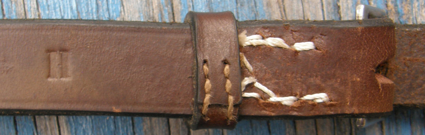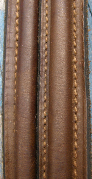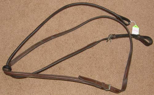 7/8” rounded raised leather standing martingale with darkened edges. Loop attaches to English caveson under chin, loop with buckle to attach to girth, 5/8” rounded raised leather neck strap. Measures 49” as adjusted now on 2nd hole out of 5 holes. Comes with rubber martingale stop. Not marked as to maker so brand unknown, probably imported leather. Leather is in excellent used condition, rubber ring has stress cracks.