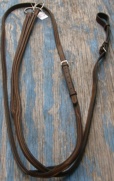 1” rounded raised leather running martingale with darkened edges & round raised 1/2” neck strap. Measures approx 54” as adjusted now in smallest/shortest hole out of 6 holes. Brand unknown, probably imported leather, but in excellent hardly used condition. Stamped F for Full/Horse.