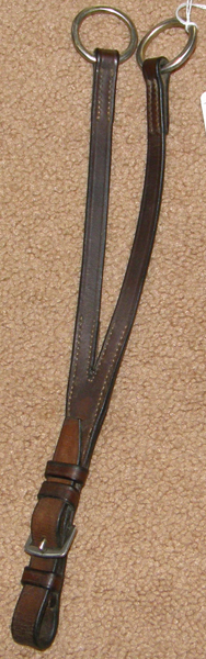 Running martingale attachment in flat leather with scored edges, & buckles into any breast plate with a center ring. Matches most popular bridles. Approx 16 1/2” long as adjusted now in center of 5 holes & includes snap, which make it a breeze to attach or remove. 5/8” wide leather, single buckle end, each side piece is adjustable with conway buckles & 5 holes. Brand unknown, stamped Cob size.
