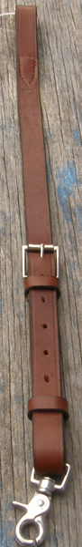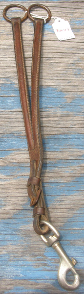 Running martingale attachment in round raised leather & buckles into any breast plate with a center ring. Bolt snap was added for easy attachment. Approx 17 1/2” long including snap(14 1.2" without), 1/2” wide leather, single buckle end. Some surface cracking of leather when tightly bent. Brand unknown.