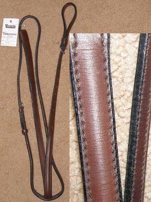 Round raised standing martingale with edges scored, rubbed & darkened. 5/8” round raised quality standard leather with 1/2” round raised neck strap, tagged Thornhill Victoria 2084 P(pony). Matches raised pony bridle EBR78.