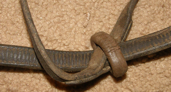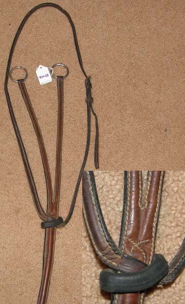 5/8” leather standing martingale with round raised center for 1st part of strap, loop that attaches to caveson under chin, loop to attach to girth & has 1/2” round raised neck strap. Measures 52” as adjusted now with room to make it slightly longer or much shorter, so this strap may not be original to the neck piece even though they both are round raised. Stamped Pony but brand unknown. Was quality leather but is well used with some wear at holes & surface cracking on strap back to girth. Comes with used rubber martingale ring.