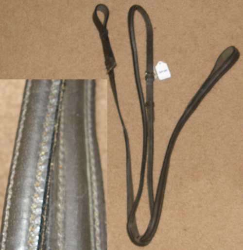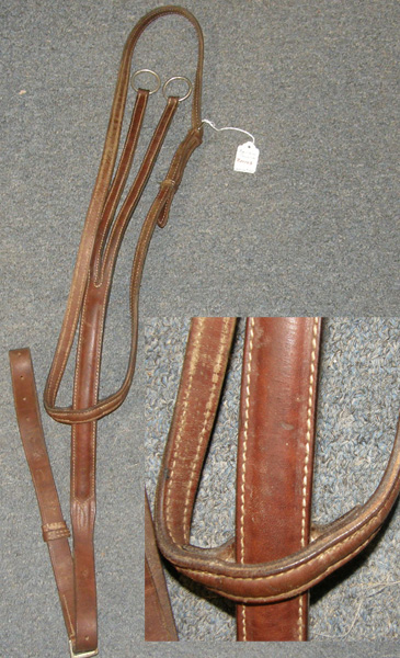 7/8" tapering to 5/8” rounded raised leather running martingale with darkened edges, contrast stitching, & 1/2” neck strap with round raised center. Decorative loop stitching at V in leather. Comes with black martingale stop.Measures 44 1/2” as adjusted now in 3rd hole out of 10 holes. Not marked as to size or brand, but owner used on a Cob sized pony & is made out of soft quality leather. Some rust on 1 ring, buckle mark around 1 hole on neck strap, & a few crimp marks on neck strap.