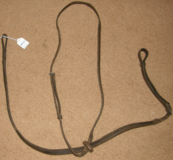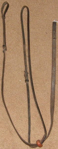 5/8” flat leather standing martingale with loop that attaches to caveson under chin, loop to attach to girth, & has 3/8” flat neck strap. Measures 49” as adjusted now with 5 more holes to make shorter & 9 holes to make longer. Stamped Made in England but brand unknown. Was quality leather but has some surface cracking on strap back to girth. Comes with used rubber martingale ring.