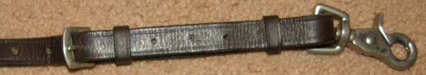 Standing martingale attachment in quality 5/8" wide flat leather with scored edges & snaps into any breast plate with a center ring. Matches most popular bridles. Approx 24 1/2” long as adjusted now & including trigger snap end, with room to make it smaller or longer. Single buckle end, & snap is removable. Snap works well & leather is supple with only a few small scuffs. Brand unknown, but came in with some Collegiate breastplates.