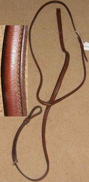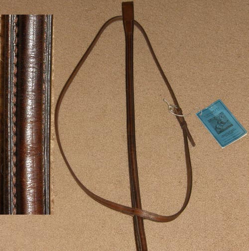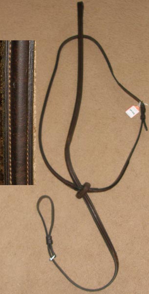 5/8” quality leather with round raised center, loop that attaches to caveson under chin, loop to attach to girth, & 5/8" has round raised neck strap. Stamped Weaver Leather & F for Full/Horse. New, no tags, very minor scuffs from store handling.