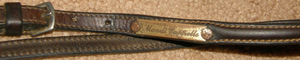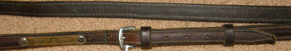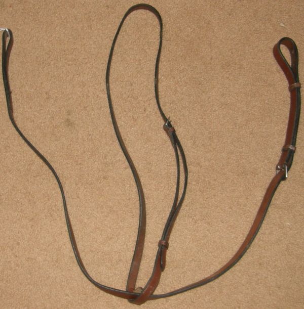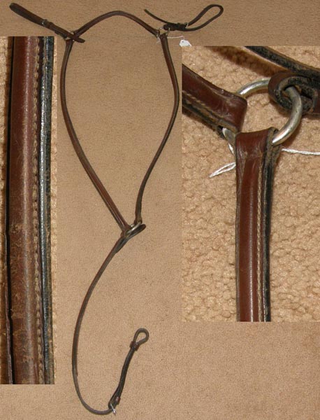 3/4” flat leather running martingale with scored, rubbed & darkened edges, white contrast stitching, stainless steel rings, & 5/8” flat leather neck strap. Measures 46 1/2” as adjusted now in 4th smallest hole out of 9 holes. Stamped C for Cob & Rodrigo(Pessoa). Butter soft quality leather.