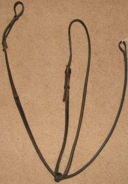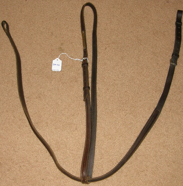 1” flat leather standing martingale with scored & darkened edges, loop that attaches to caveson under chin, loop to attach to girth & has 5/8” flat neck strap. Brand unknown, only stamped Made in India & O/S(Oversized) with what looks like an F(Full sized horse) over top so may have been miss tagged as O/S & is really regular horse size, which is what we think it is. Measures 47” as adjusted now on shortest hole with room to make longer, plus 2 holes added to make it way shorter. Supple leather, & in excellent used condition.
