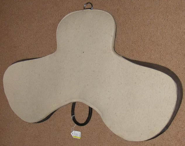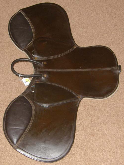 English lead line saddle for the youngest riders. Underside is made of felt, top is leather with padded knee rolls. Has a rolled leather grab strap, front D's for breastplate attachment, & D in back for crupper attachment. Great saddle to learn to ride on. No padding to force the child into a seat, yet gives the youngster the ability to develop a correct seat without interference. Seat measures approx 14” from front of saddle to back or 12” from metal button to back of seat. Not marked, brand unknown. Excellent hardly used condition with "buttons" have some minor rust.