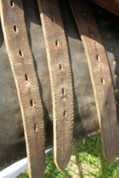 Brown leather older dressage saddle marked Fels Bach Ag, Switerland, & a name ending in rist, 16 on flaps. Was told this was an early/older version of Courbette saddle. Billets are in good shape with no pulled through holes, but leather is worn in places both top & bottom. Seat measures 17" from the button(see photo), but flap is stamped 16 so may be a 16". Lots of scuffs & wear. We have no other information on this saddle, we have listed what we know.