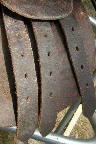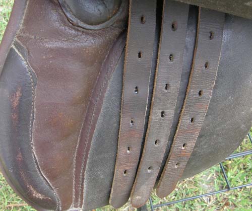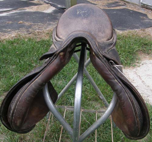 An older dressage or sport saddle, 2 billet style. Not marked as to maker. Billets are in good condition & has a lightly padded smooth leather knee roll. Good used condition with lots of rubs & scratches, but should polish up nice.