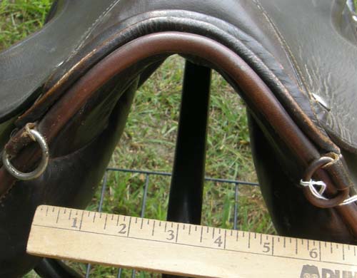 Oldie but goodie close contact jumping saddle, great for equitation or jumping. No knee rolls, only small blocks under flap. Has billet guards, & billets are in great shape with no pulled holes. Measures between a 16 1/2 & 17", but you can see where we measure. Some spots/stains & a few minor scratches, but otherwise excellent used condition. Leather very supple but under flaps needs a good cleaning.