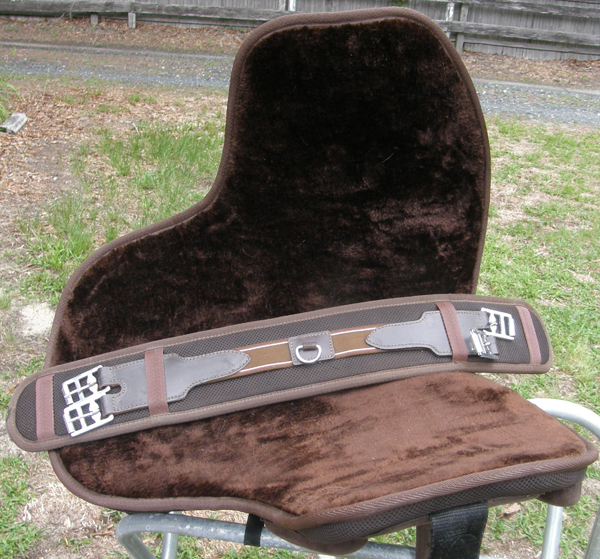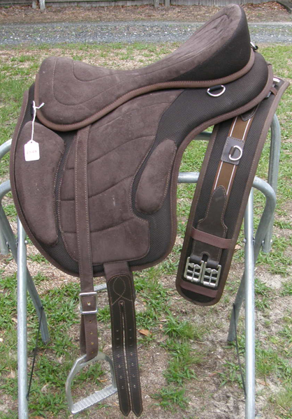 Treeless English saddle with removable padded suede seat, suede covered flaps, front & back leg bblocks, conway buckle adjustment on single in line holes on synthetic stirrup leathers, D rings front & back for attaching breastplate, saddlebags, crupper, etc, & has long double billets that attach at bottom of flaps for less bulk under the legs. Measures 17" as shown or 18" from where the button would be on a traditional English saddle to cantle. Fully lined with synthetic fleece, this can be used with a pad or without similar to a bareback pad. Lightweight & comfortable for both the horse & the rider. Comes with 4 1/2" wide fleece lined synthetic girth with elastic insert center, roller buckles, D ring for attaching training aid or breastplate & measures 23" from buckle to buckle or 29 1/2" overall. Owner used this only once or twice so in excellent hardly used condition. Comes with aluminum English style stirrups with 4" tread.