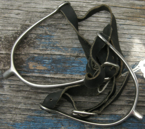 These spurs have a 3/4'' long neck with blunt end, squared spur strap slots, 3" wide opening, approx 3 1/2" deep, & 5/16" rounded band. Brand unknown. Comes with excellent condition black nylon web spur straps. Brand unknown.