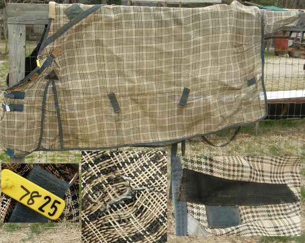 Closed front nylon scrim sheet with D ring at withers for hanging or hood attachment, single belly surcingle, reinforced areas around all buckles, adjustable rear leg straps & tapered/fitted rear. Tagged size 78". Clean & in like new condition with a few small spots/stains. 2 available.