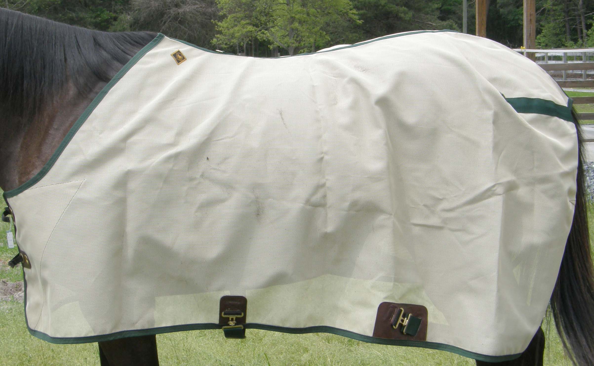 Polyester mesh material helps control flies, mosquitoes, gnats, & other insects. Blocks up to 70% of harmful UV rays. Features standard neck, shoulder gusset, fleece at withers with D rings for attaching a hood, adjustable belly band, double buckle front with velcro for added security, & tail cord.