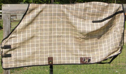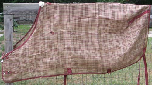 Cooler style fly sheet in lightweight mesh open weave fabric, breathes to help keep your horse cool, aids evaporation and keeps insects away. Perfect cover for shows-keeps horse's coat clean and protected after grooming, while tacked or untacked. Great fly sheet to use on horse either alone or over tack at a show or while stalled, being hot walked, etc. Machine washable. Measures approx 88" long at topline with 45" drop with wide soft nylon browband. Brand unknown. A few small spots/stains but no holes that we can see.