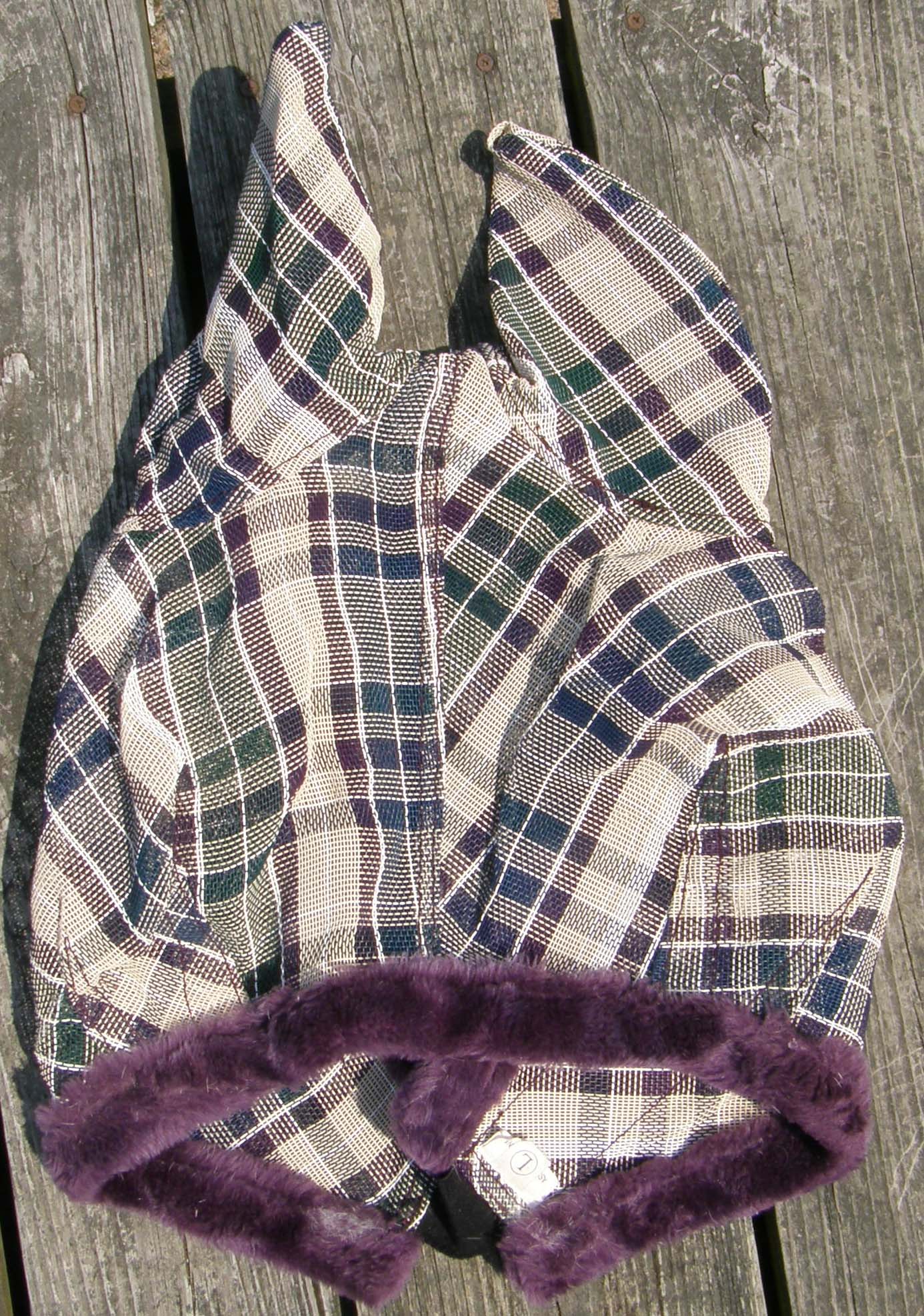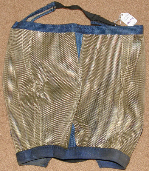 Super fine mesh fly bonnet with ears, protects from even the smallest bugs or no-see’ums. Soft flannel lining around muzzle, 2 Velcro closures at throat. Light dirt & minor hairs to fleece lining but no holes that we could see.