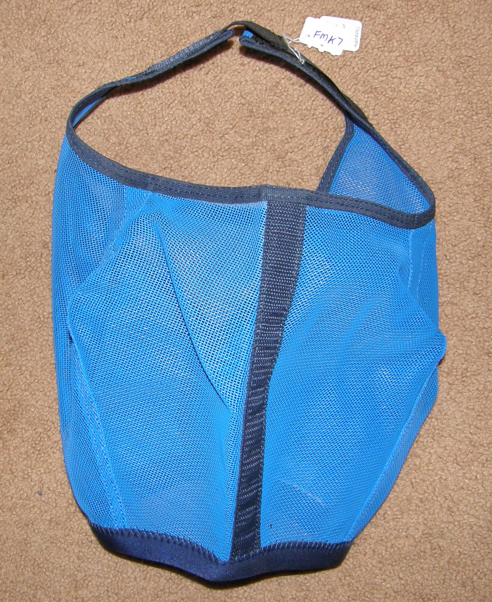 Dark navy blue soft & stretchy mesh with navy/lt blue binding. Wide velcro with 2 plastic snaps for a secure closure under the neck & elastic strap with velcro closure at poll for attaching to halter. Fits behind ears to the bottom of neck. Use as a neck fly cover or over a Slinky/Sleazy type hood to prevent rubs to lycra fabric. Great for covering wounds or bandages too. Brand unknown. Lycra liner over mane area was ripped so removed. Measures 29" from poll to withers. Clean with a few small repaired holes.